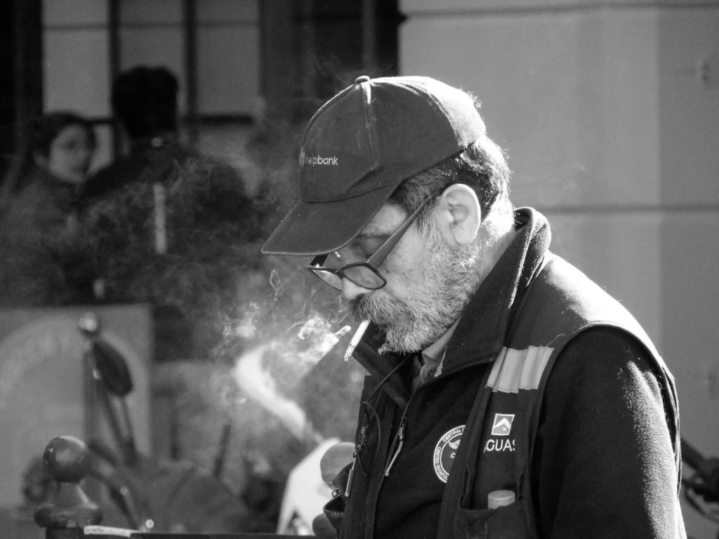 El uso del blanco y negro refuerza el carácter atemporal de la escena y concentra la atención en las texturas: la barba canosa, la tela gastada de la vestimenta, el humo que se disuelve en el aire frío. La iluminación lateral genera un modelado suave pero preciso del rostro, destacando la expresión sin dramatizarla, lo que contribuye a una lectura honesta y no sensacionalista del sujeto. El fondo urbano, ligeramente desenfocado y poblado por presencias difusas, sitúa al personaje en lo colectivo sin restarle individualidad.
