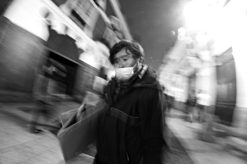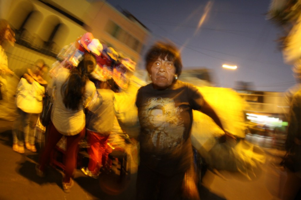 La estética de la imagen, marcada por el movimiento, el desenfoque y la iluminación artificial nocturna, refuerza esta lectura. El uso del lente gran angular extremo no busca nitidez clínica, sino transmitir la sensación de agobio, urgencia y desbordamiento. El cuerpo de la mujer aparece casi absorbido por el entorno, como si su identidad se confundiera con el flujo continuo del mercado. Esta elección visual dialoga con la experiencia real de las porteadoras: jornadas extensas, ritmo incesante y una existencia social que oscila entre la visibilidad funcional —cuando se necesita su fuerza— y la invisibilidad social.