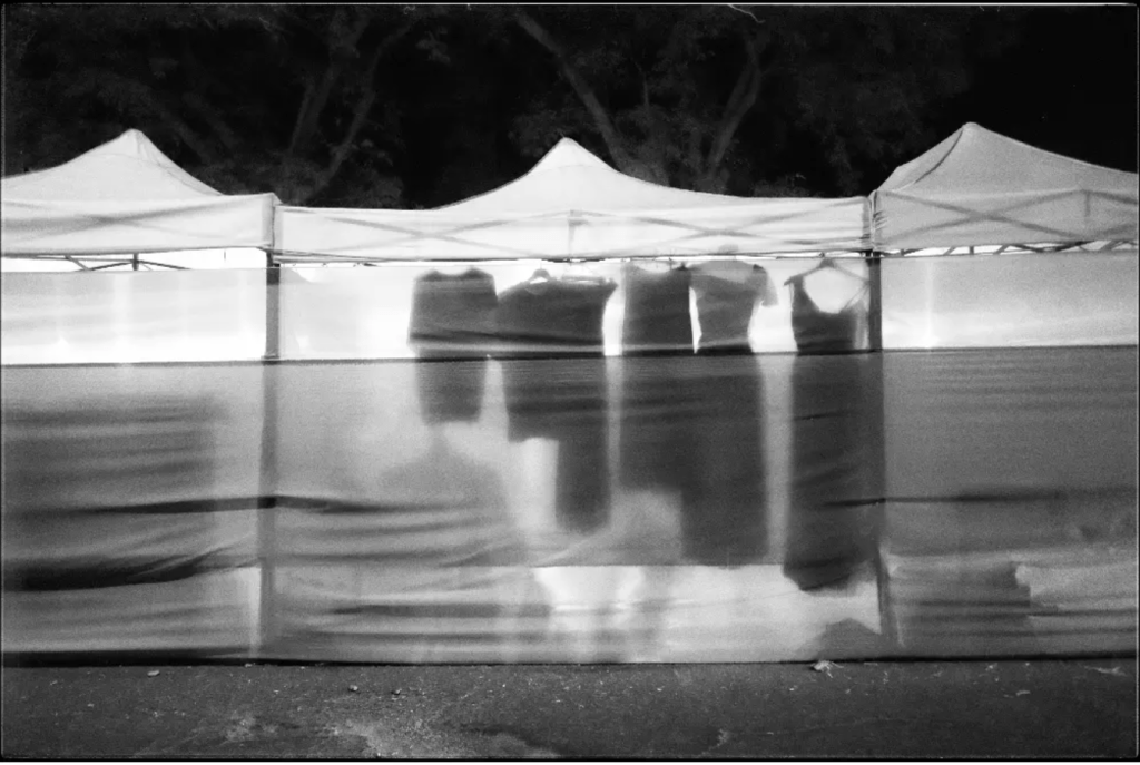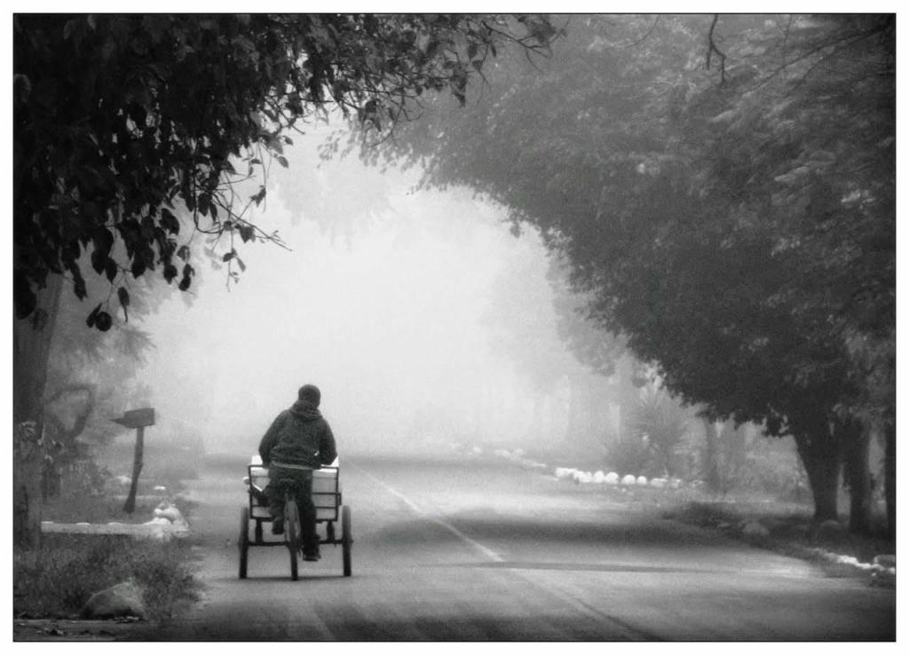 El encuadre genera un túnel natural formado por los árboles, que guía la mirada hacia el fondo difuso y otorga profundidad psicológica a la escena. El uso del blanco y negro, con una escala tonal suave y dominante de grises, elimina distracciones cromáticas y enfatiza la dimensión emocional del recorrido. La textura del asfalto y la bruma contribuyen a una sensación de quietud casi meditativa.