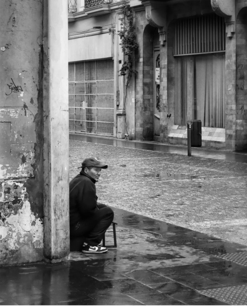 Desde una lectura conceptual, la fotografía trasciende el registro documental para convertirse en una reflexión visual sobre el paso del tiempo, la vejez y la marcha silenciosa de la vida cotidiana. No hay dramatismo explícito, sino una melancolía contenida, sostenida por la economía de elementos y la claridad compositiva. La imagen no interpela con urgencia; invita a detenerse y observar, convirtiendo el desplazamiento físico del sujeto en un viaje introspectivo.